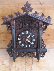 Wanduhr im Bahnhäuslestil mit Rebenlaub Schnitzereien und ebonisierten Stäben.
