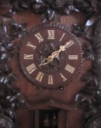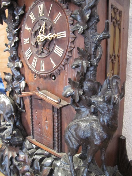 Tischuhr im Jägerstil mit üppigen Schnitzereien um 1880.